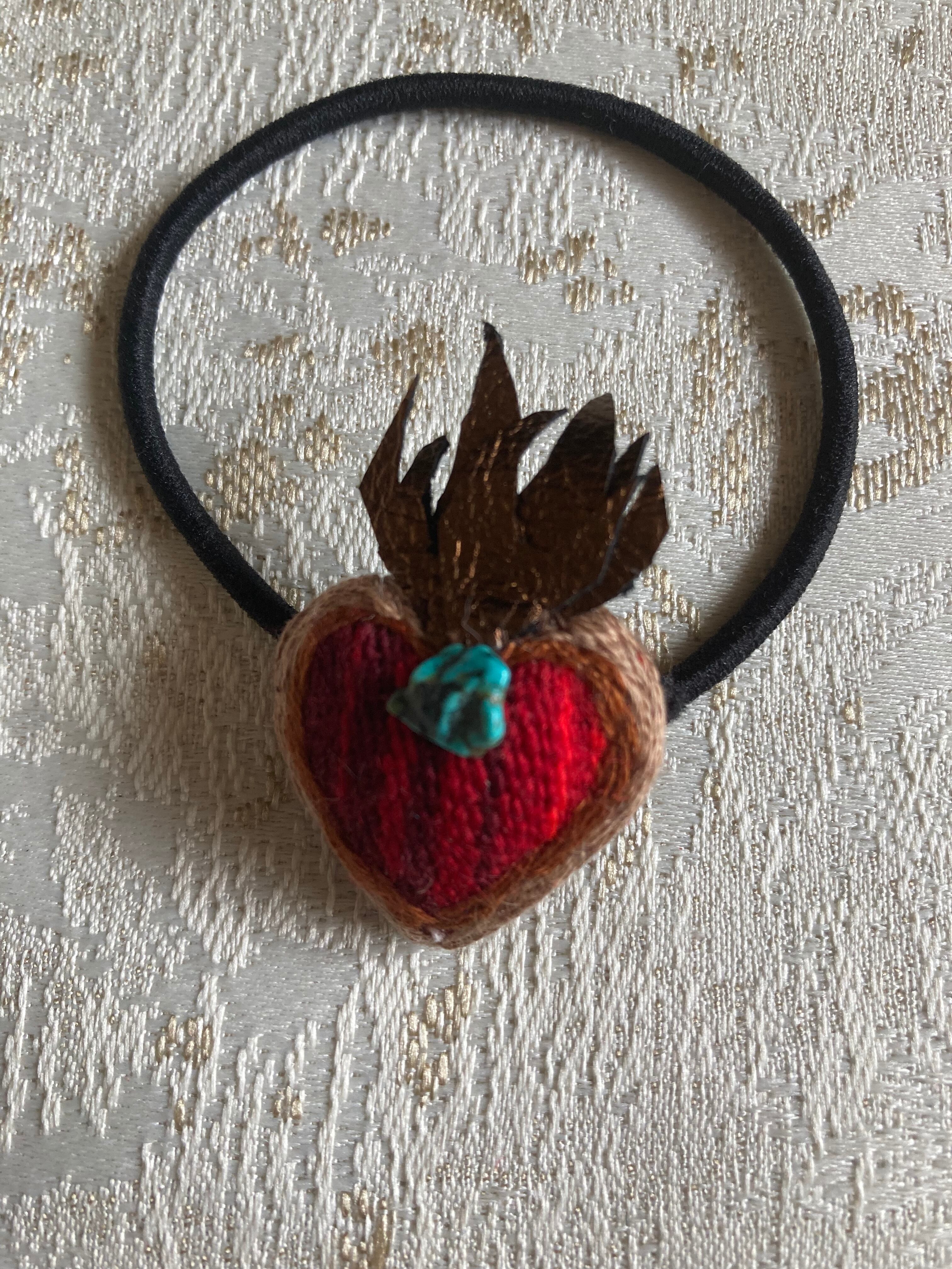 メキシコのサラッペに刺繍とレザーで装飾したコラソンモチーフのヘアゴム☆
