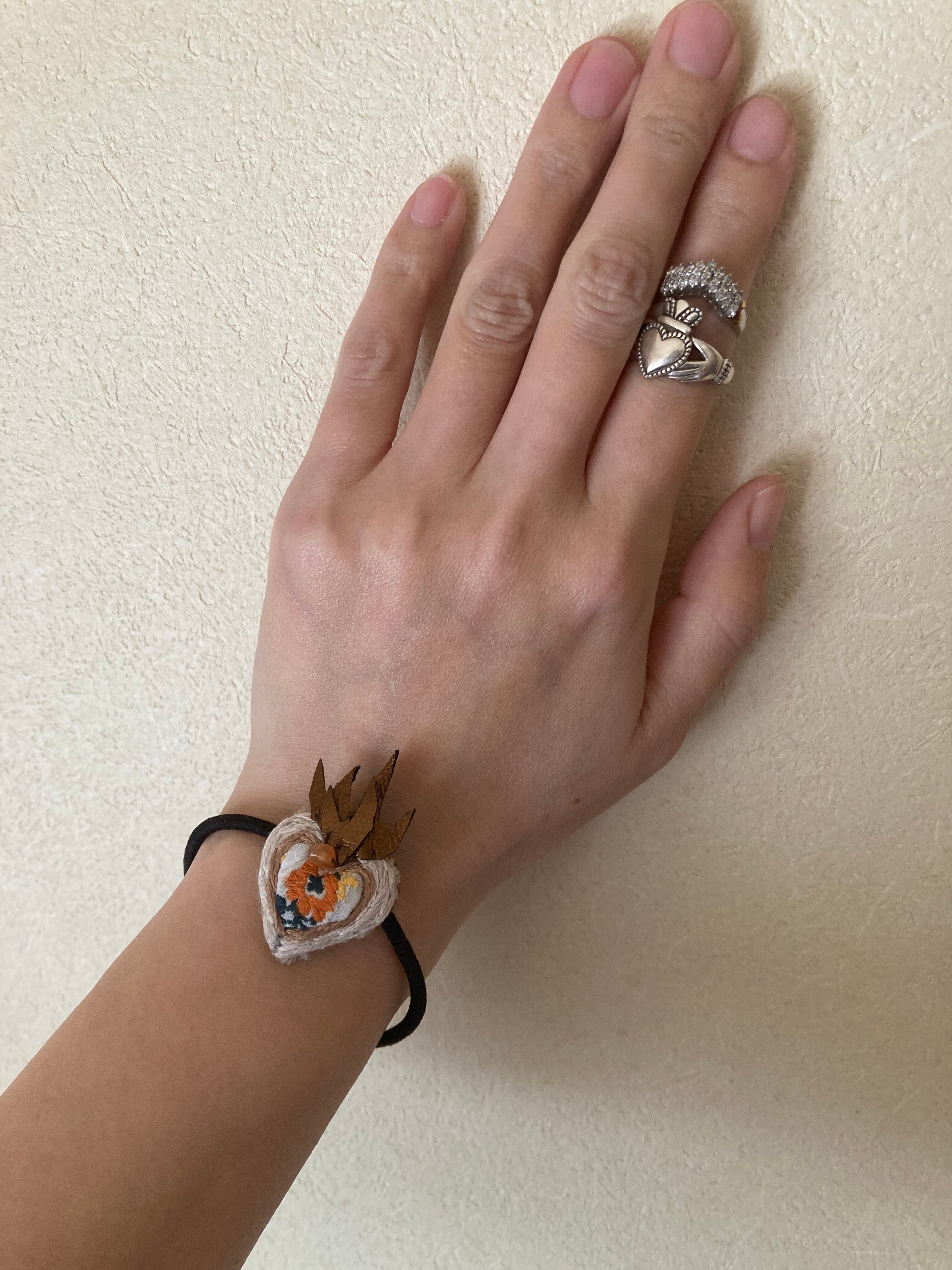 チロリアンテープに刺繍とレザーで装飾したコラソンモチーフのヘアゴム☆