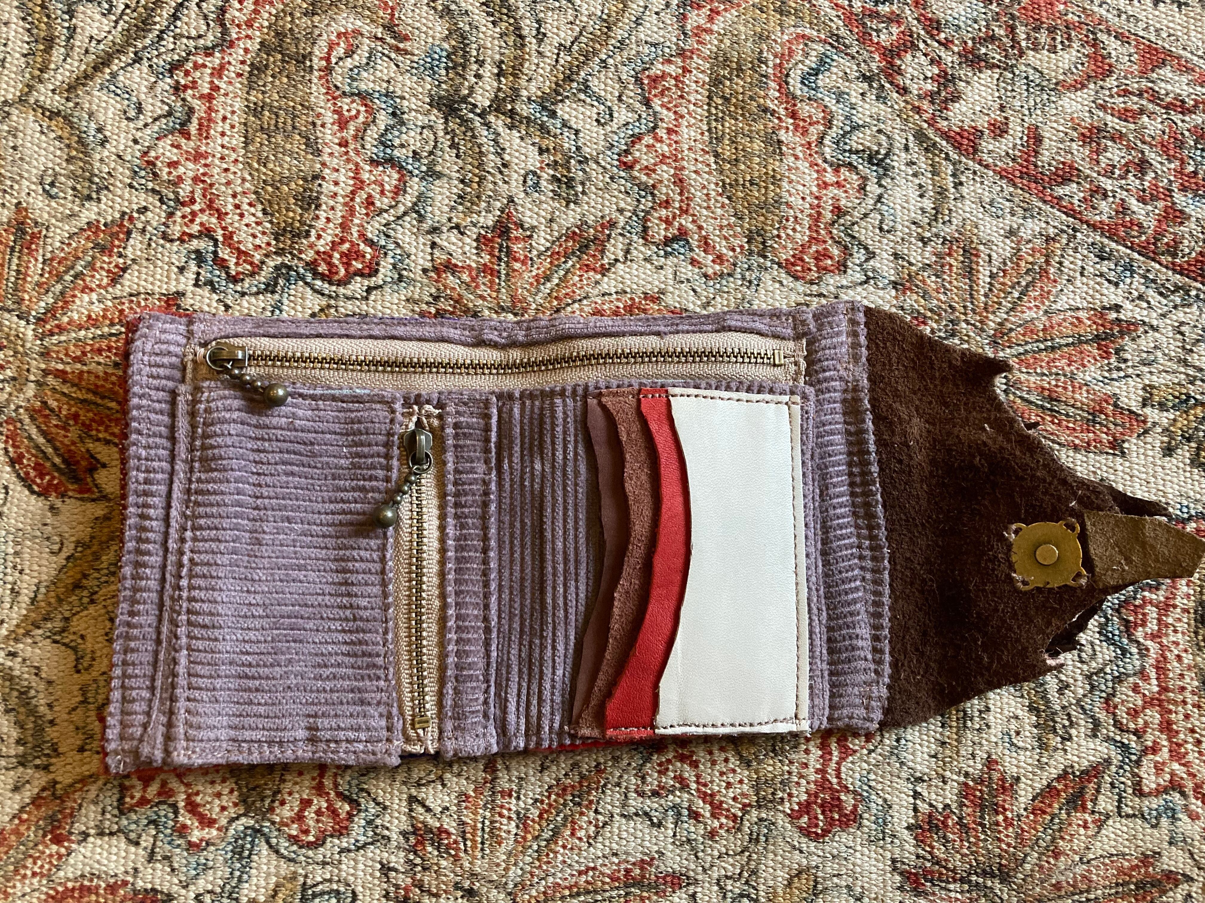 裏地にはスモーキーパープルのコーデュロイ生地を使っています