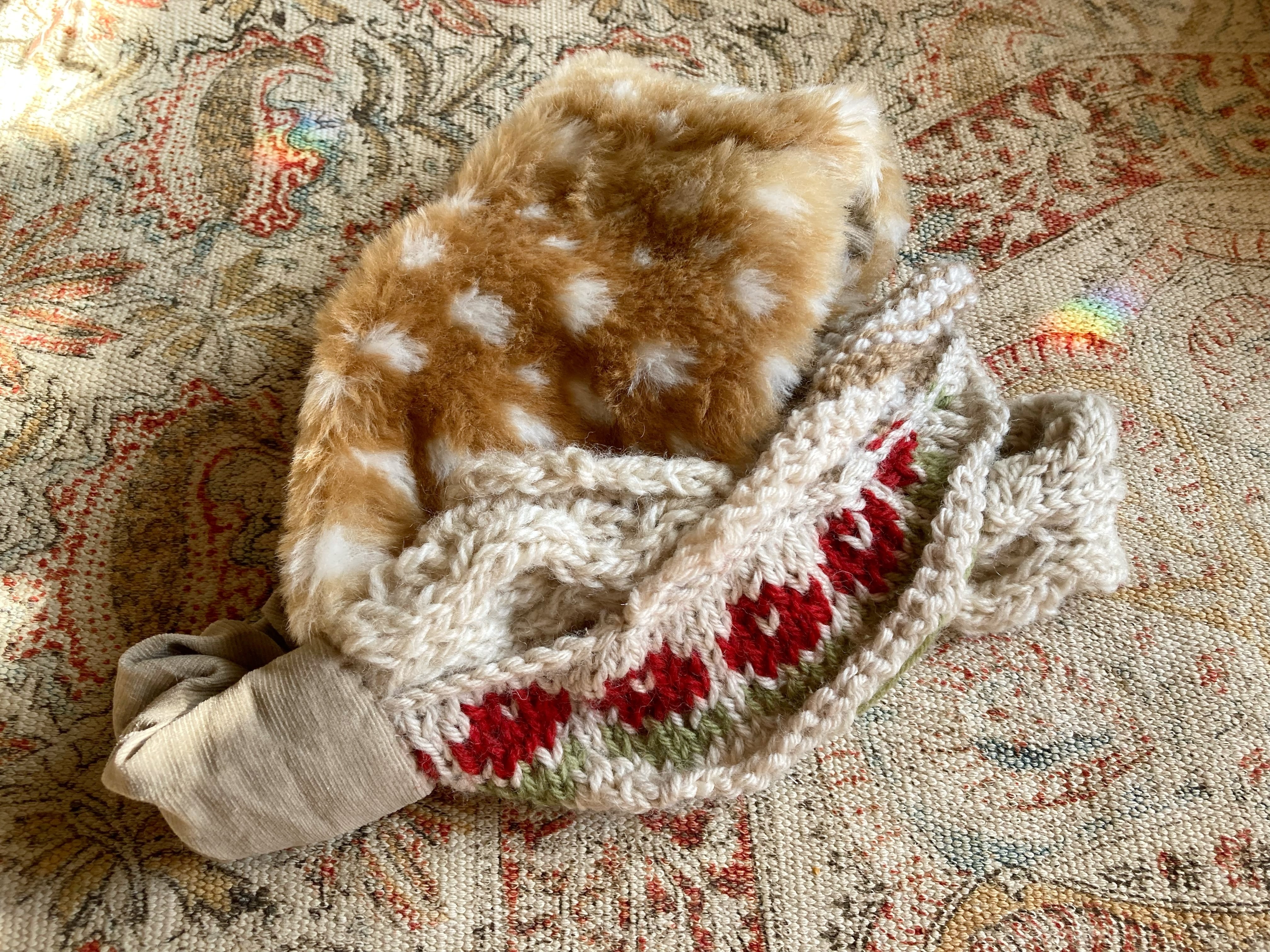 ヴィーガンファーに、さまざまな編み方のハンドニットを重ねたヘアバンドです☆