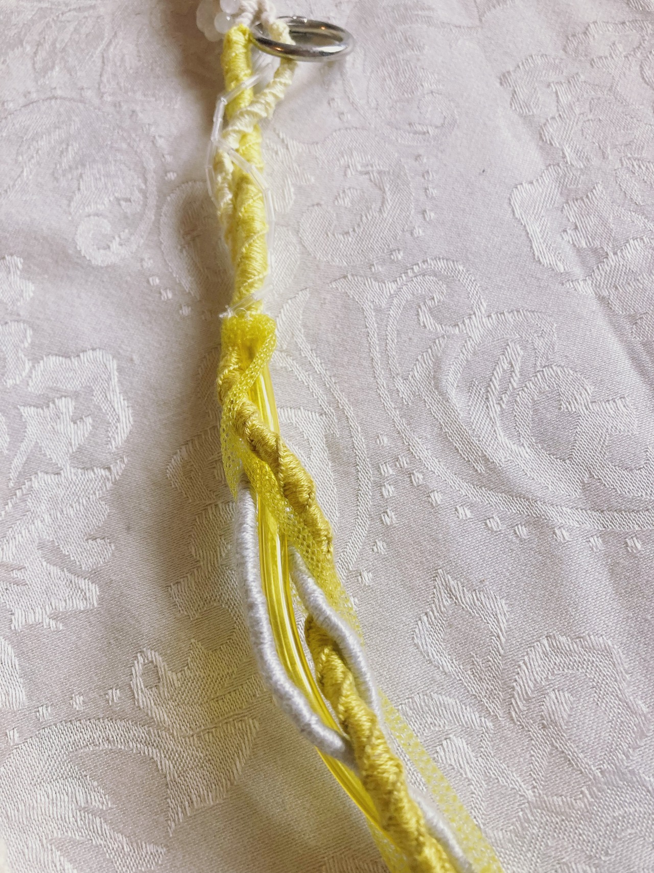 刺繍糸、ビニールチューブ、チューブ状のサマーニット、竹ビーズ…etcさまざまな素材を組み合わせ、