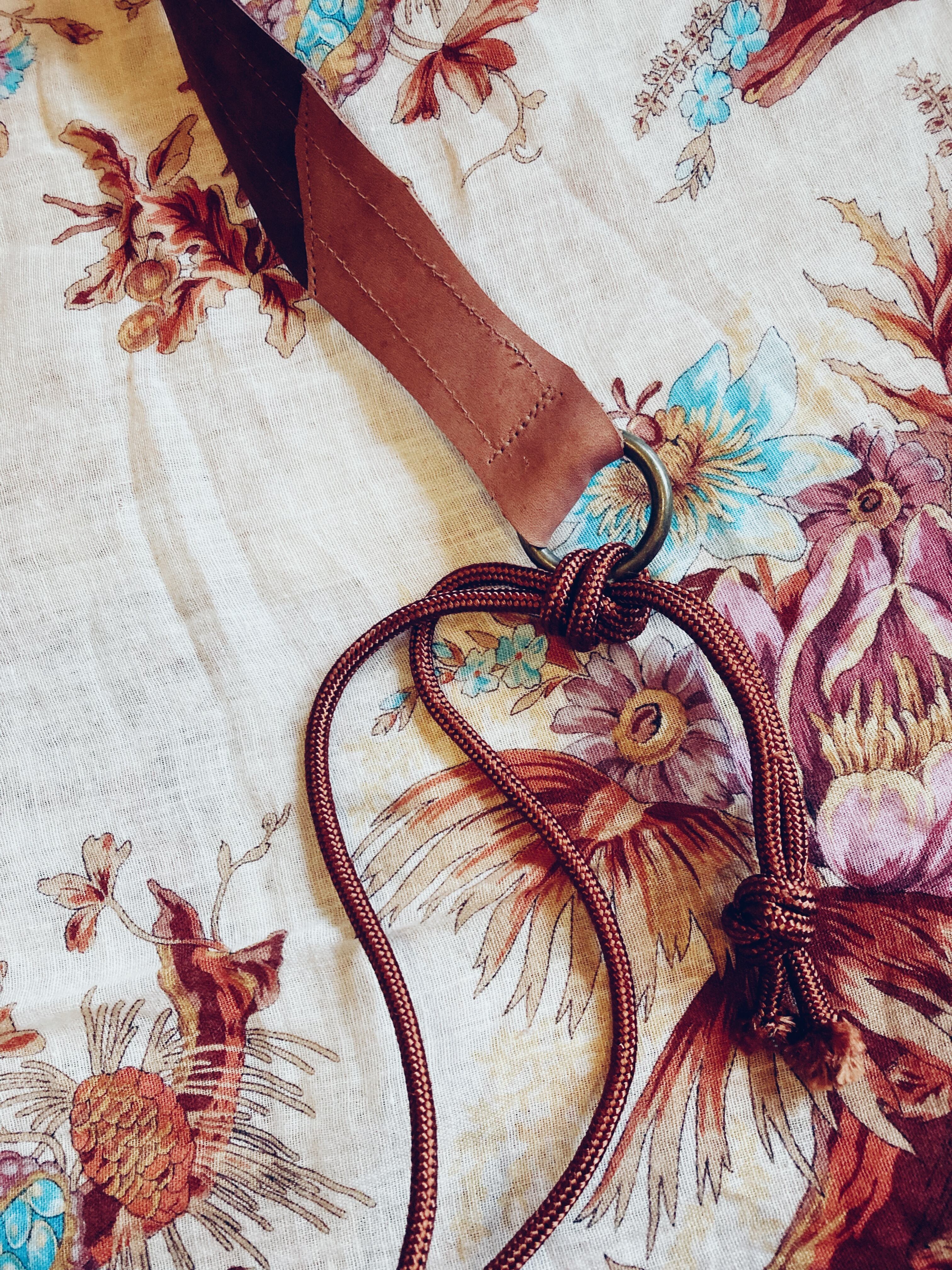 スモーキーなピンク調のレザーを組み合わせたベルトに結ぶことで斜めがけバッグとしてもお使いいただけるデザイン!